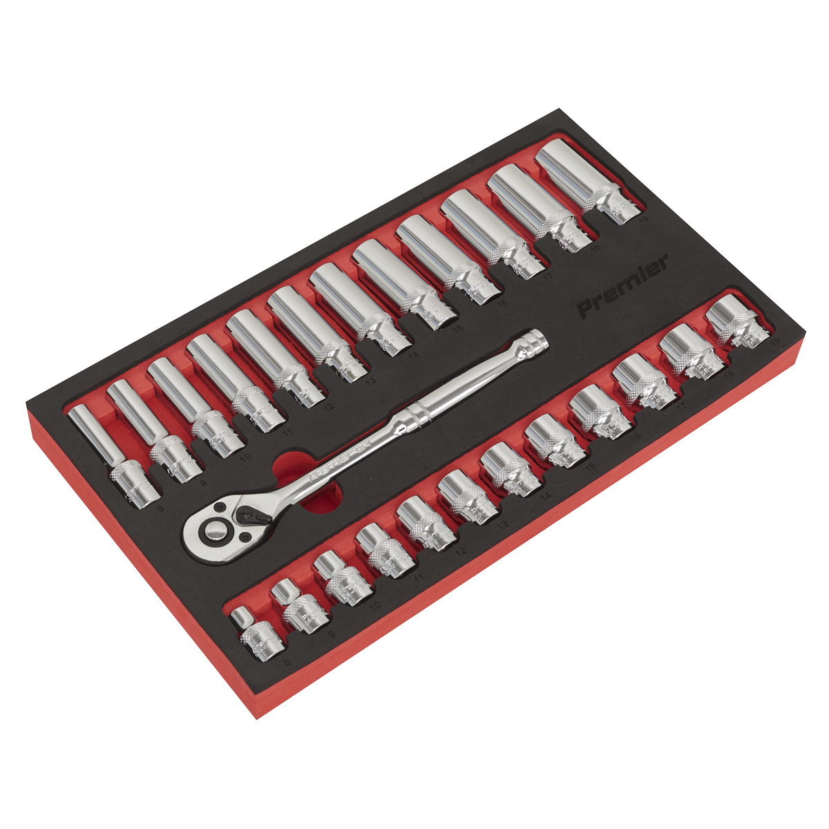 • Socket Sizes: Standard and Deep; 8-19mm.
