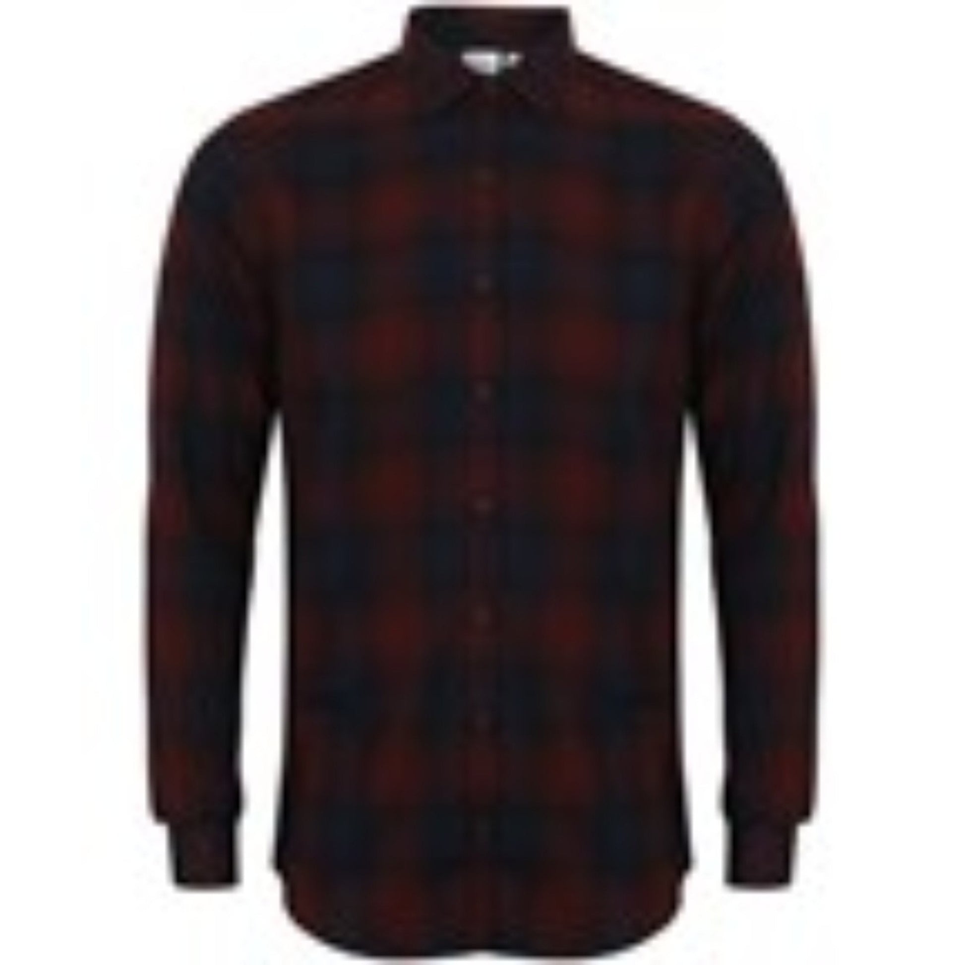 Stand out in style in a distinctive check, with soft-brushed finish. This on-trend relaxed style features narrow button-down collar, curved hem, topstitching details and matte pearlized buttons. It also has tear-out label for super easy rebranding.