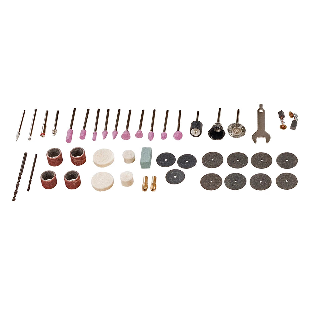 Multi-function rotary tool with accessories for detailed cutting, grinding, polishing, and carving. Variable speed control and spindle lock. 2 x collets provided for mandrels 2.4mm and 3.2mm. Suspension loop. No load speed 8000-32,500rpm.