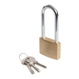 Solid brass body with chrome-plated, hardened steel shackle and multi-pin tumbler mechanism. Includes 3 brass keys. Horizontal x vertical shackle clearance: MSS03L 22 x 56mm, MSS04L 26 x 71mm. Shackle dia: MSS03L 6.5mm, MSS04L 8mm.