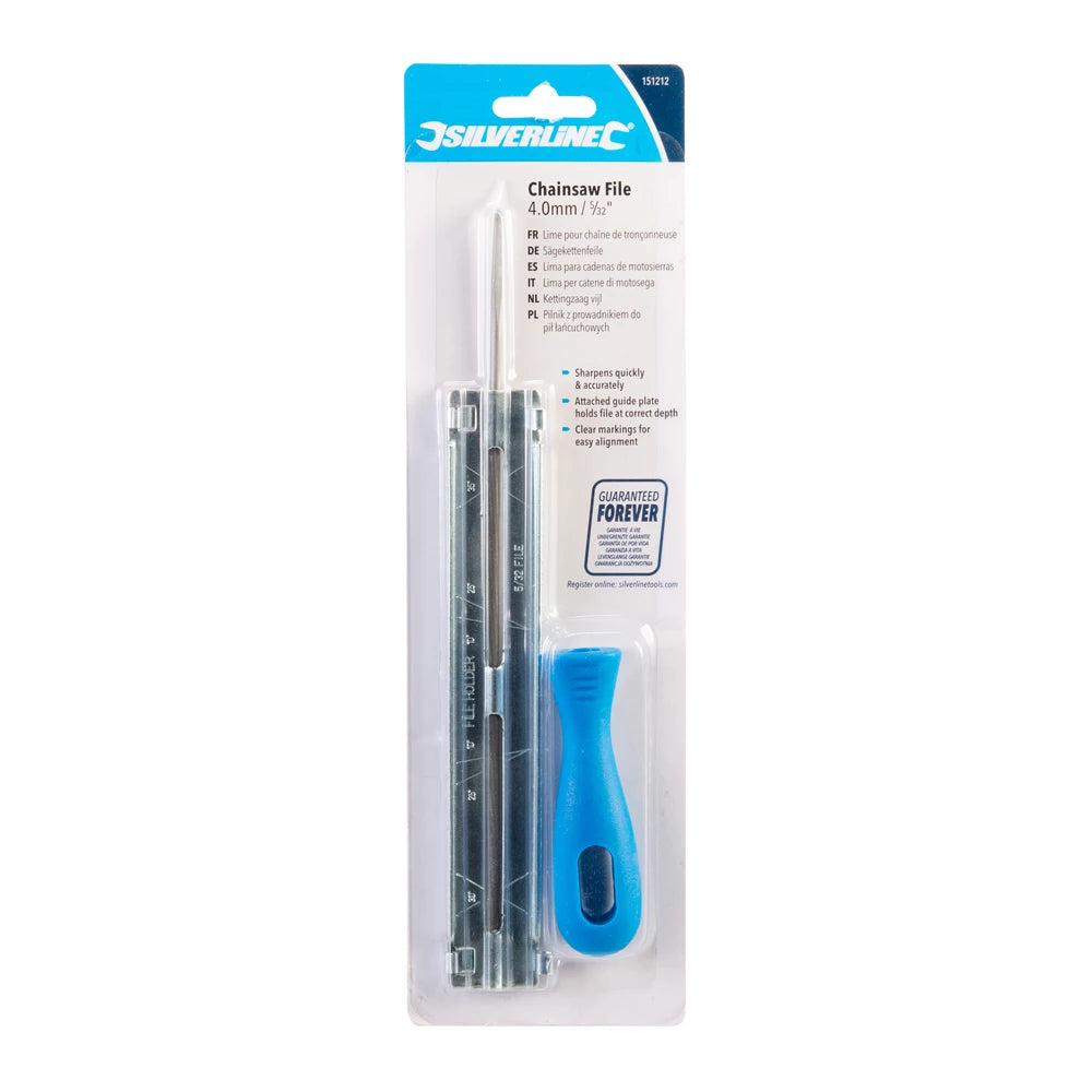 Round file designed for sharpening chainsaw chains quickly and accurately. Attached guide plate holds file at correct depth, clear markings for easy angle alignment.