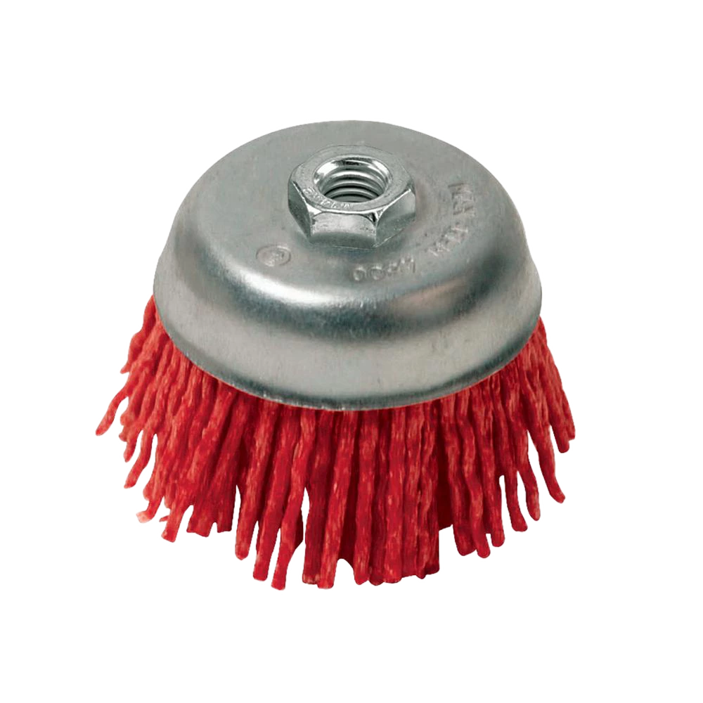 Nylon threads impregnated with coarse silicon carbide grit for deburring and surface treatment of metal and wood. Non sparking. M14 x 2 female thread.