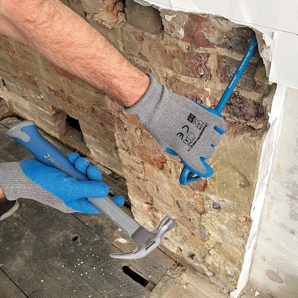Heavy duty construction for general usage. 10-gauge polycotton shell and latex-dipped palm. Abrasion, tear and puncture resistant. Supported glove, anatomical design, crinkle finish and knitted wrist. Intermediate design.
