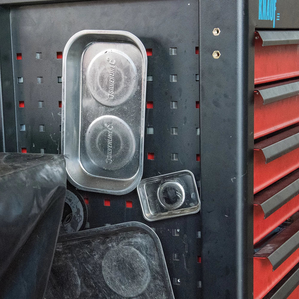 Stainless steel with soft base. Adheres securely to ferrous surfaces without marking.