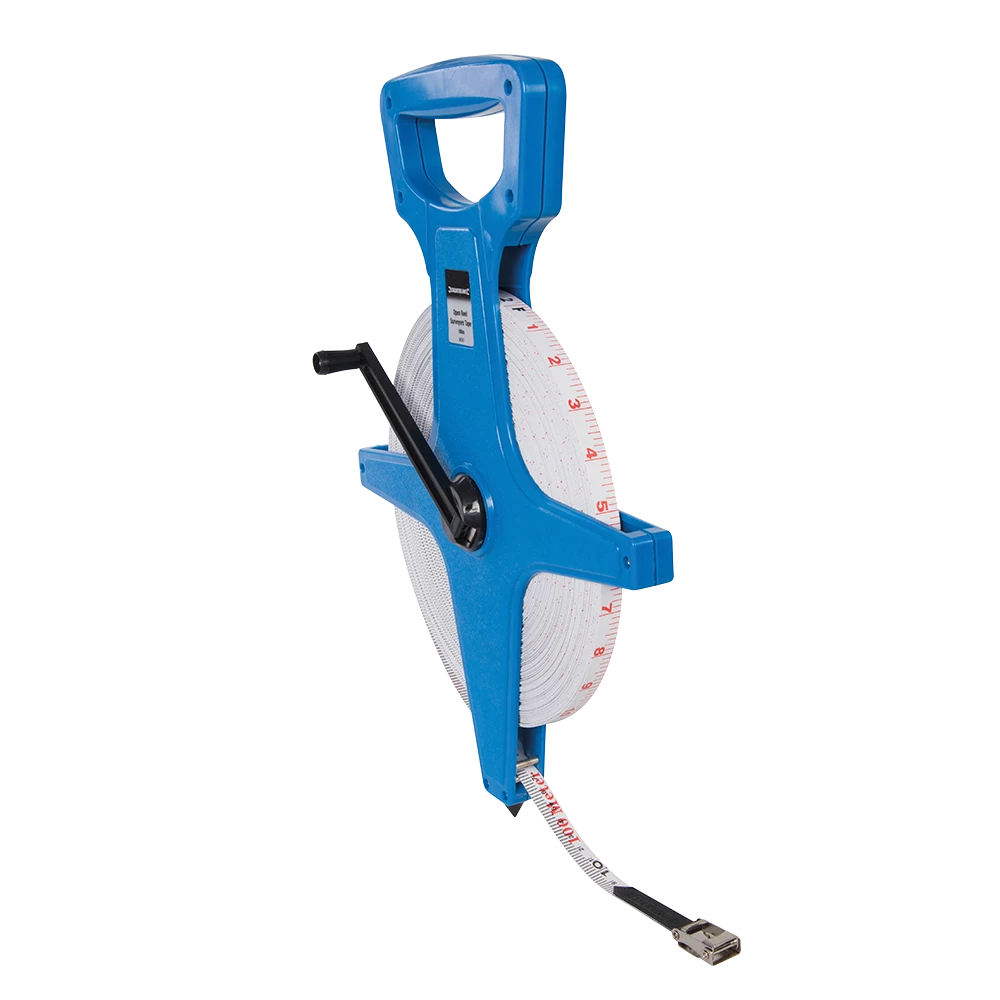 Heavy duty fibre surveyors tape with metric and imperial graduations. Strong plastic case with folding winding handle. Metal end hook & claw. Water, scratch & crease-resistant PVC-coated tape. Class III accuracy.