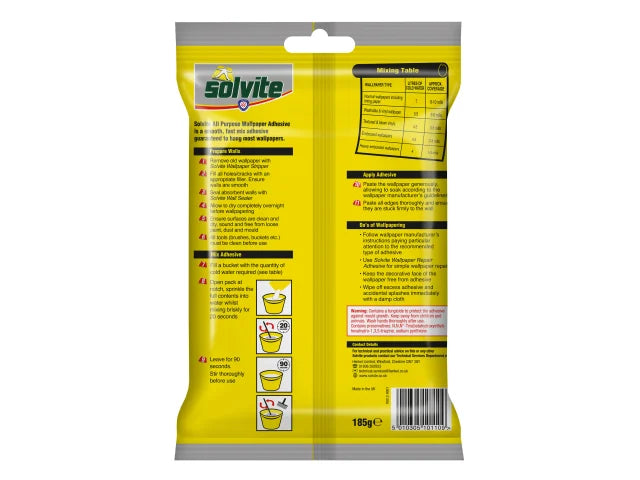The Solvite All Purpose Extra Strong Wallpaper Paste allows you to complete wall hanging projects with ease. Its smooth consistency allows easy application. The wallpaper adhesive can be mixed in just 20 seconds and is ready to use within 2 minutes. Suitable for hanging: lining papers, washable, vinyl, textured and blown vinyl, embossed and heavy embossed wallpapers.