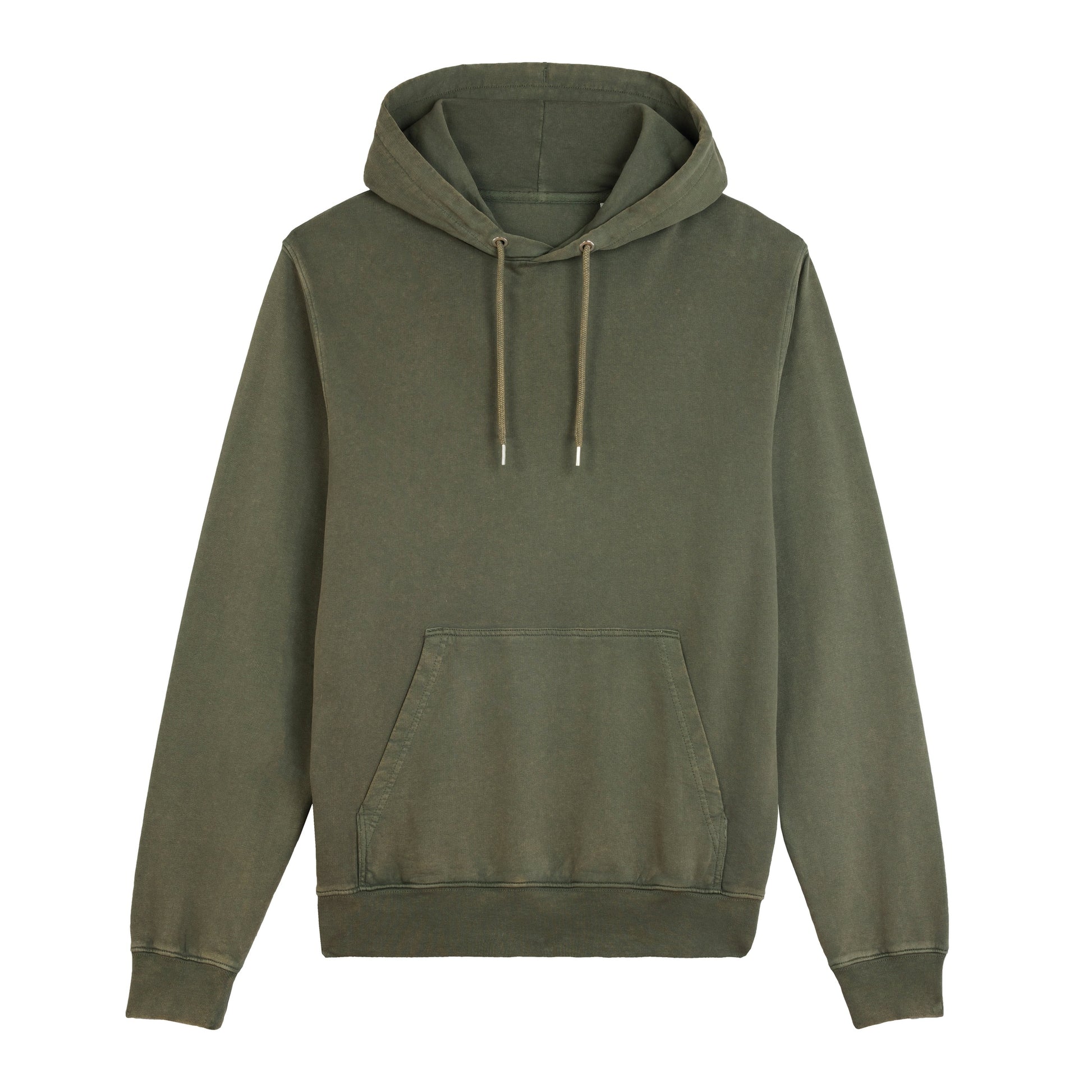 Unisex medium fit garment dyed hoodie sweatshirt. Set-in sleeve. Double-layered hood in self- fabric. Round drawcords in matching body colour with closed metal tipping. Metal eyelets. Inside herringbone back neck tape. Self-fabric half-moon at back neck. 1x1 rib at sleeve hem and bottom hem. Armhole, sleeve hem and bottom hem with twin-needle topstitch. Kangaroo pocket at front. Slight shading on seams to give washed look. Garment-dyed product: each garment may vary in appearance, colour may bleed, follow our care label. Read carefully print recommendations.