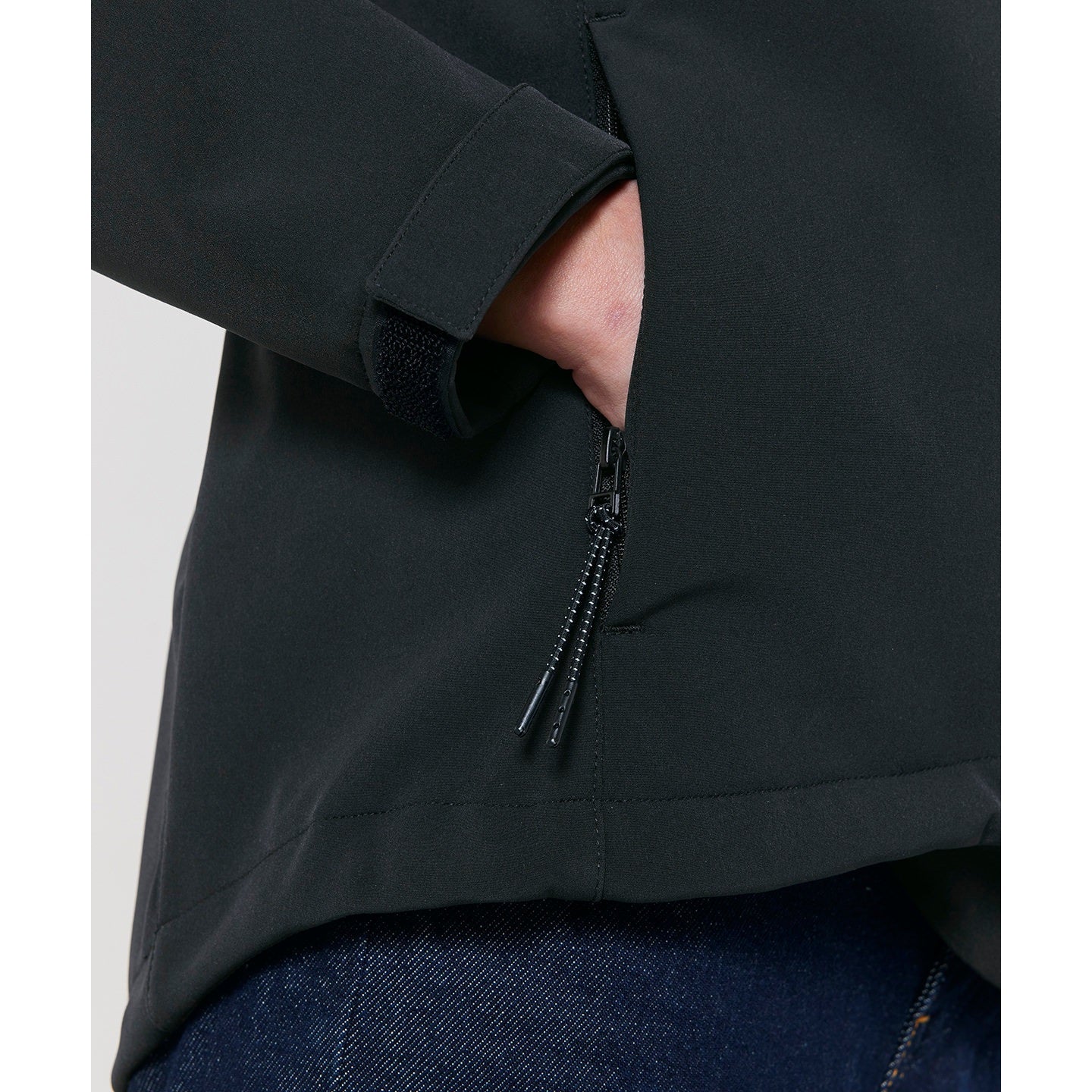 Women’s softshell jacket, medium fit with a high collar and set-in sleeve. Bottom hem with adjustable plastic stopper and elastic cord. Reverse nylon zip at centre front. Zipped outside welt pockets with reflective elastic puller. Fully bonded inside fleece layer. Side panels and stretch for better shape. Adjustable hook and loop sleeve opening. Inside seams finished with recycled binding. Water-repellent up to 10,000mm, breathability up to 3000G/M2/24hrs allowing perspiration to escape. Windproof. Bionic ECO DWR (durable, water-repellent) finish.