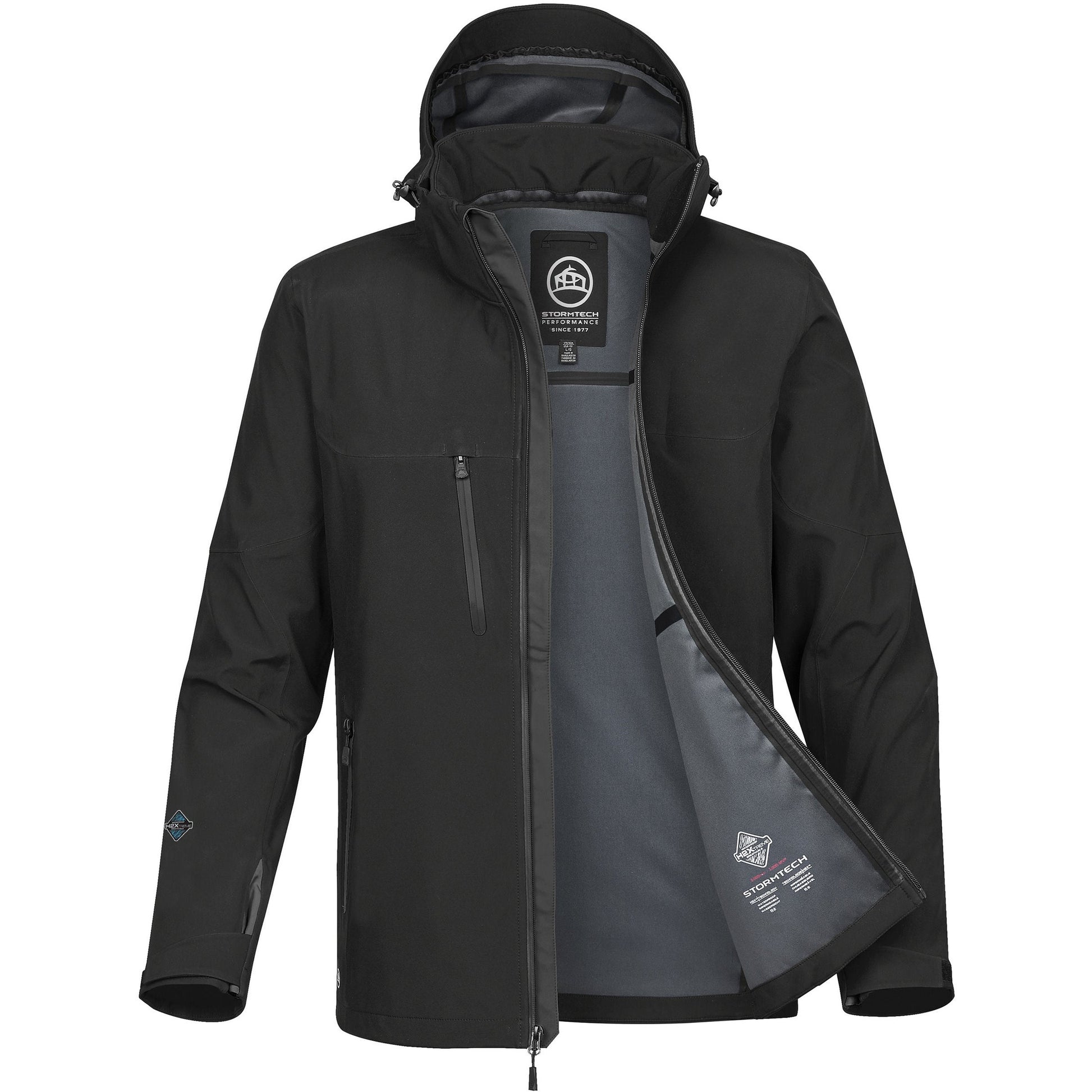 STORMTECH H2XTREME® 10,000. 3,000 Waterproof. Breathable outer shell. Sealed seams. Waterproof zippers. Detachable articulated storm hood. Adjustable shock cord hood. Adjustable hem.Dropped back. Dual chest pockets. Articulated action elbows. Adjustable cuffs with gusset. WRAP certified. BSCI certified. Oeko-Tex certified.