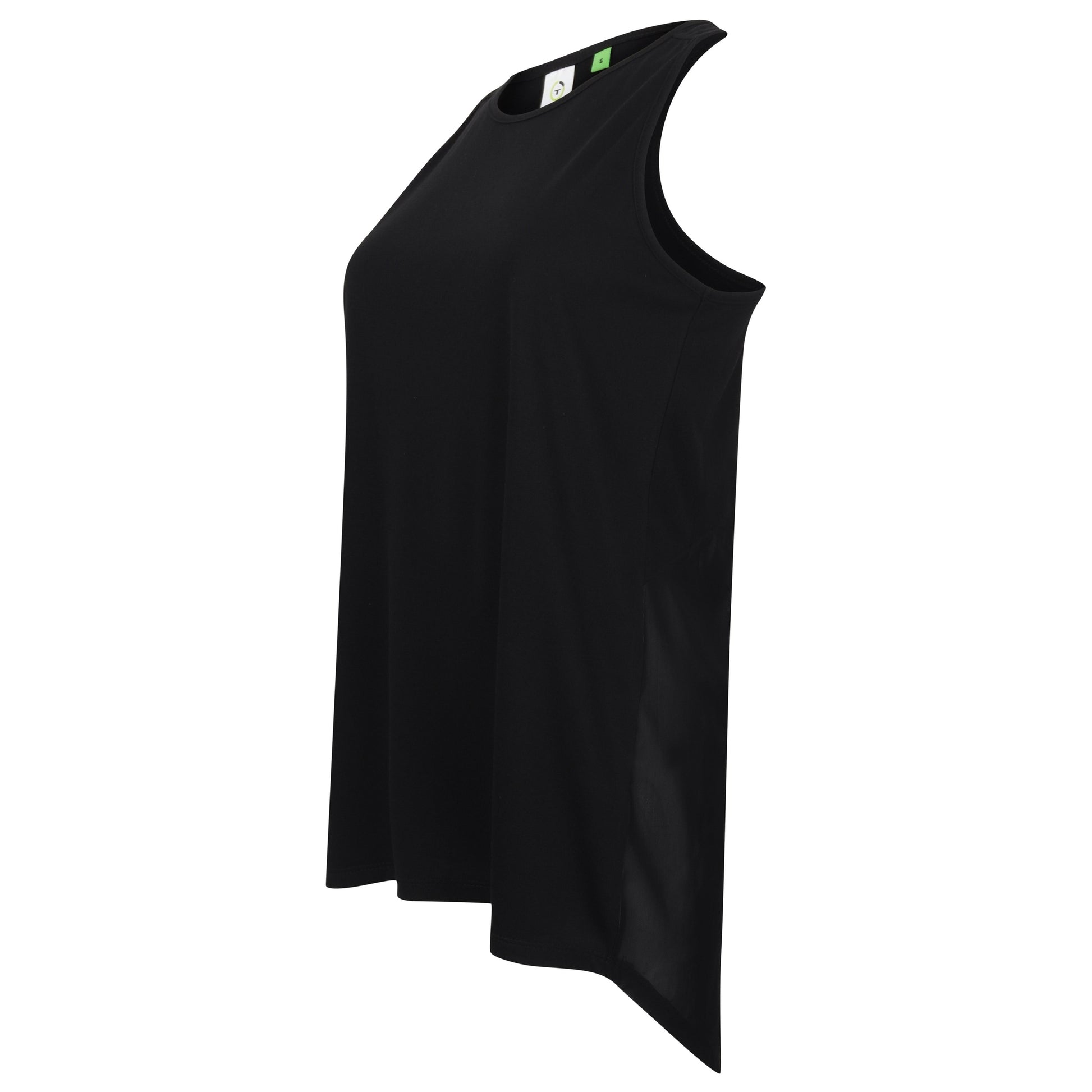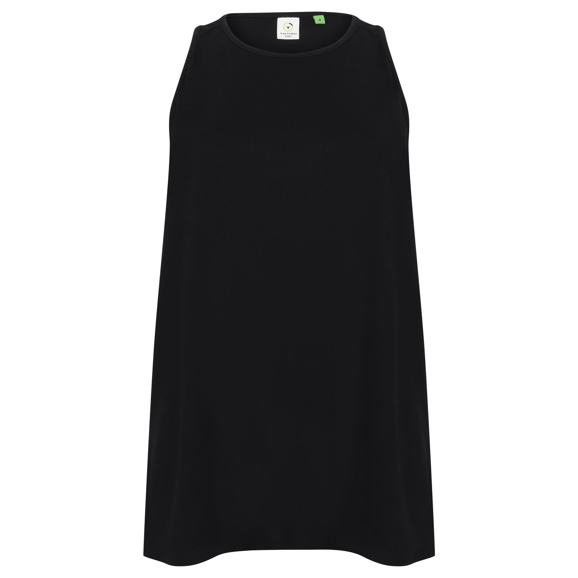 Soft-touch single Jersey fabric. Self-fabric binding at neck and armholes. Wide racer back with forward facing shoulder seams. Long back with split up the middle, which can be worn open or tied up. Curved back section where split begins. Tombo tear-out label. BSCI certified.