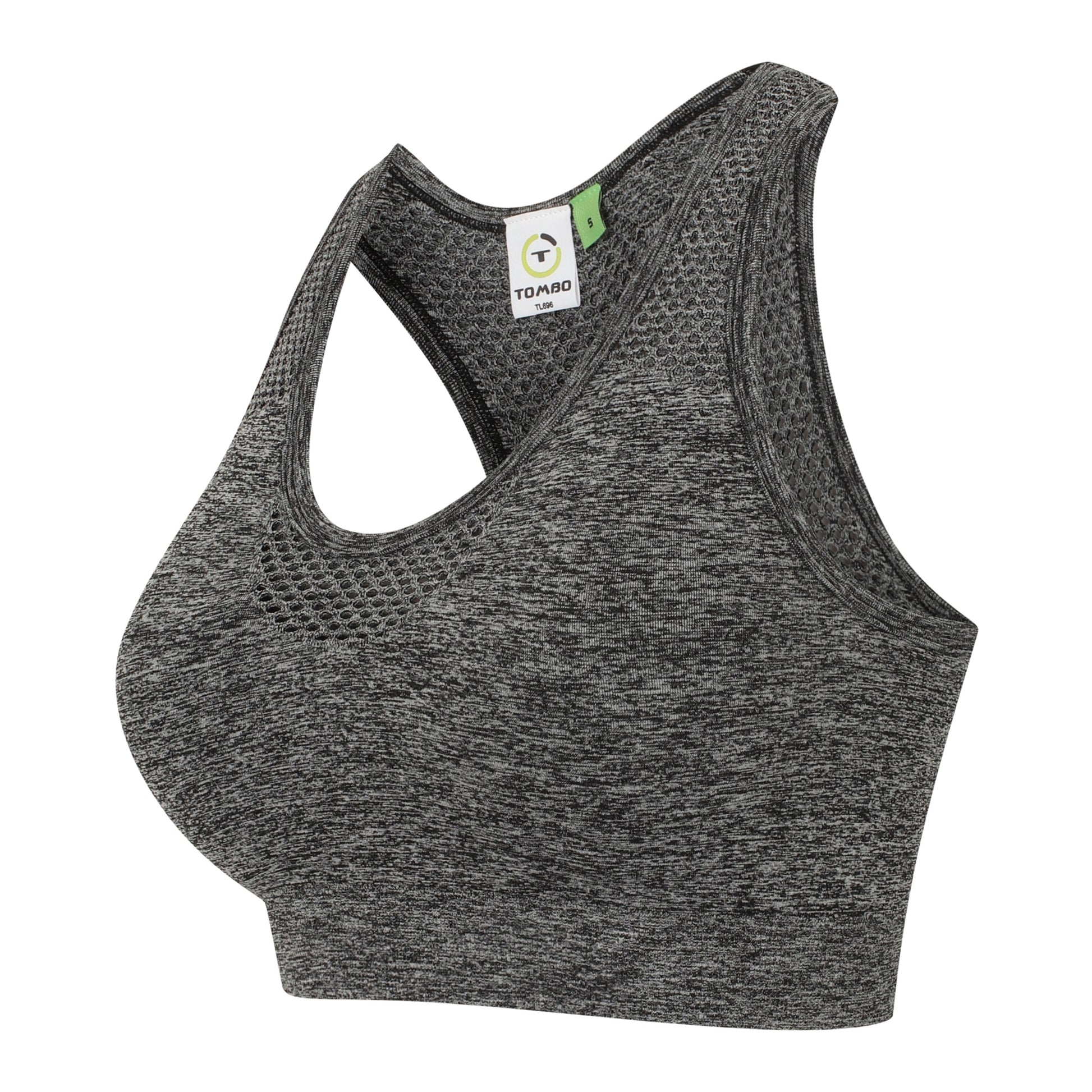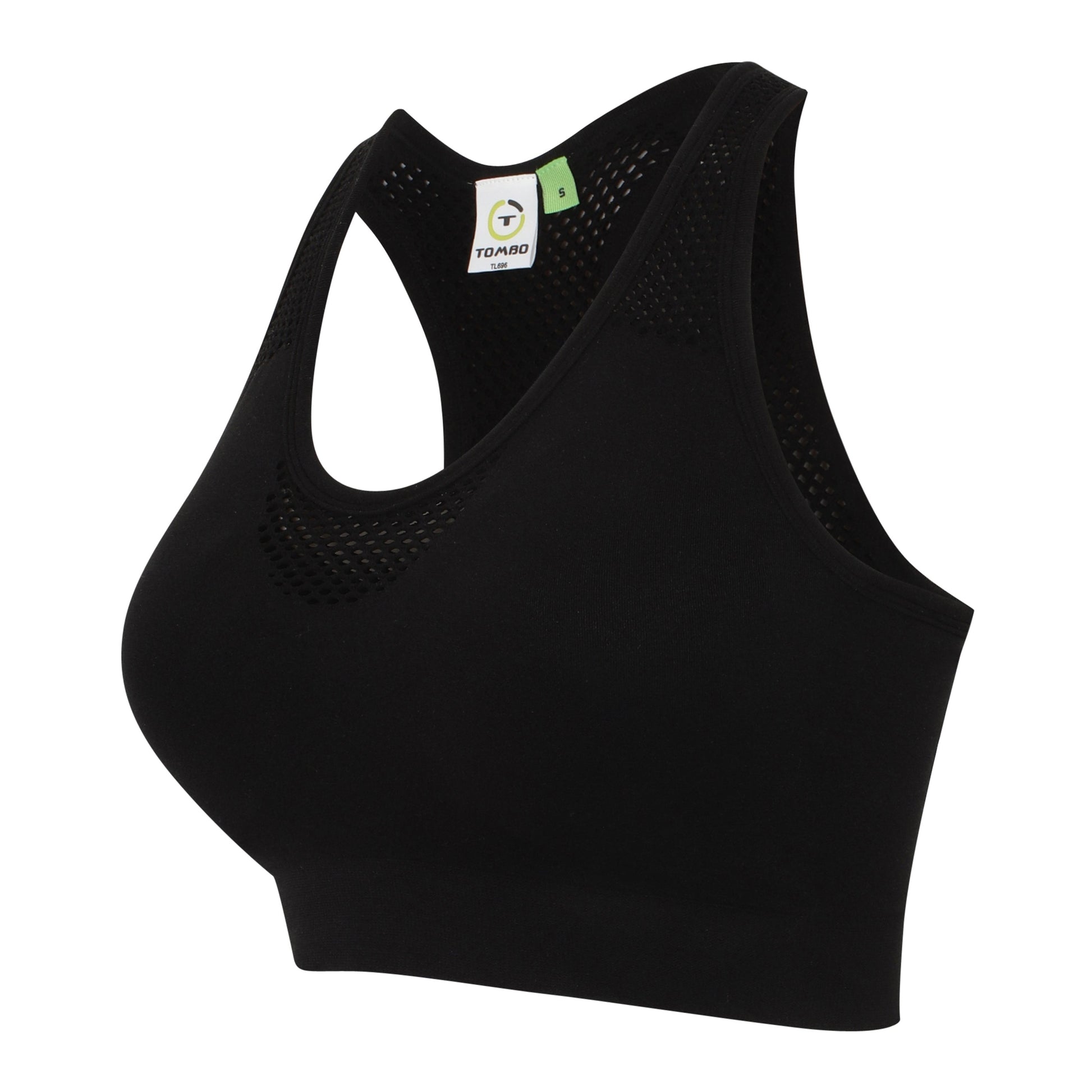 Seamless bra with removable padded cups and racerback. Self- fabric mesh inserts on front straps, V insert on front and on racerback panel. Self-fabric binding around neck, armholes and back. Tombo tear-out label. WRAP certified. BSCI certified.