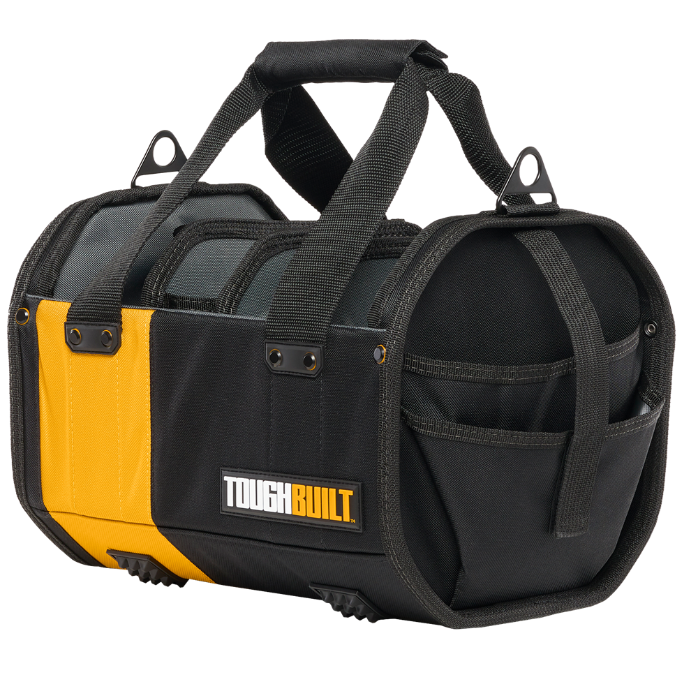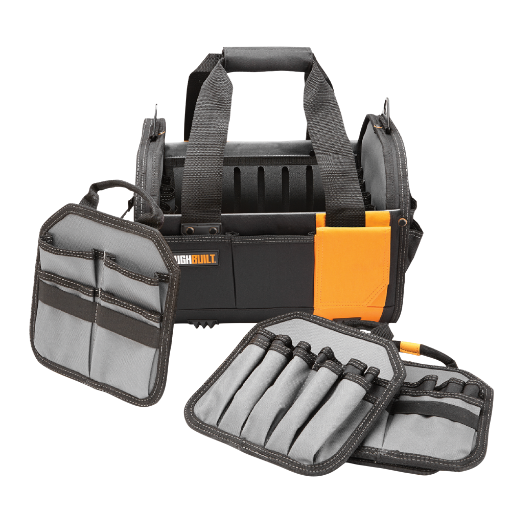 3 removable dividers with pockets. Kickstand on one divider. Rock-solid HardBody construction. Covered notebook pocket. Tape measure clip. Tape strap with steel hook. Padded handle. Rivet reinforcement. 61 pockets and loops. |