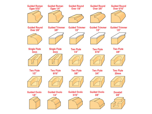 4 x Guided Flush Trim: 9.5 x 12.7mm, 9.5 x 25.4mm, 12.7 x 12.7mm and 12.7 x 25.4mm.