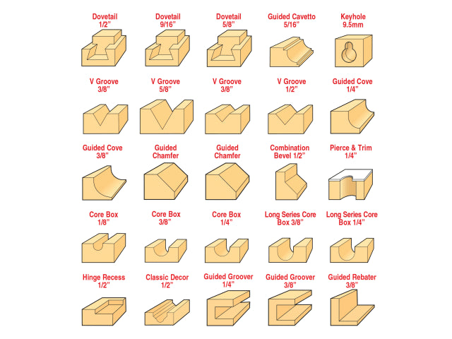 The Trend 50 Piece Router Bit Starter Set contains a range of popular 1/4in tungsten carbide tipped cutters for a variety of applications. Suitable for softwood, hardwood, chipboard, plywood and MDF. Supplied in an aluminium carry case.