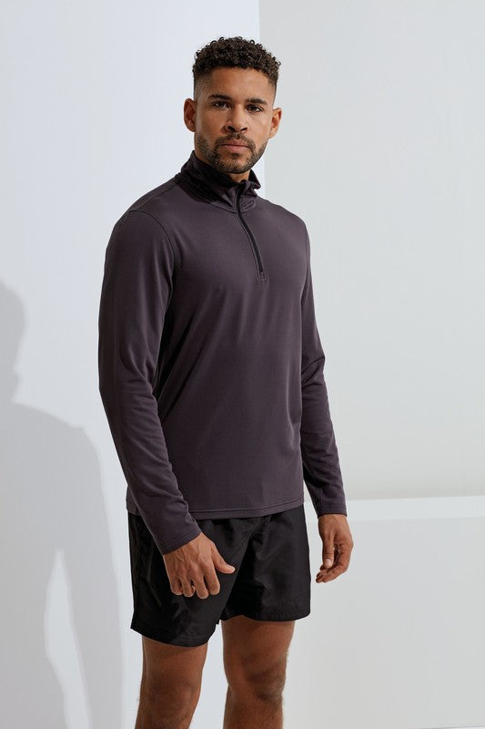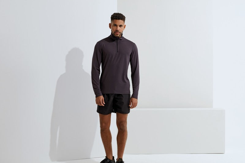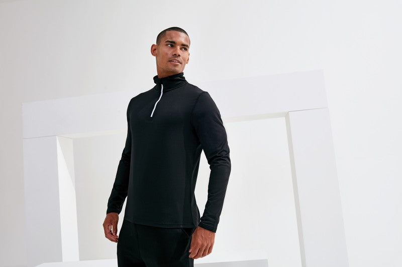 ¼ zip design. Long sleeves. Stretch. Recycled polyester. Wicking fabric. Brushed inner. The product contains no branded neck or waist label. Removable kimble or looped garment tags. The inner seam label holds important product information on one label with a second label containing brand information which can be cut-away. We recommend using block out vinyl and inks. Oeko-Tex fabric only, WRAP and Sedex certified.