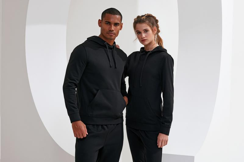 Unisex hooded style with kangaroo pocket. Drawstring cord fastenings to hood with chrome eyelets. Double-panelled hood. Cuffed sleeves and hem. Made with recycled polyester, Spun dyed technology. Spun dye melts colour pigments and recycled polyester together, creating coloured fibres using 75% fewer chemicals, 66% less water and 60% less CO2. Spun dye fabric also improves the colour-fastness of garments. BSCI certified. SEDEX certified. WRAP certified. We recommend using block out vinyl and inks.Product contains no branded neck or waist label.* Removable Kimble or looped garment tags. Inner seam label holds important product information on one label with a second label containing brand information which can be cut-away.