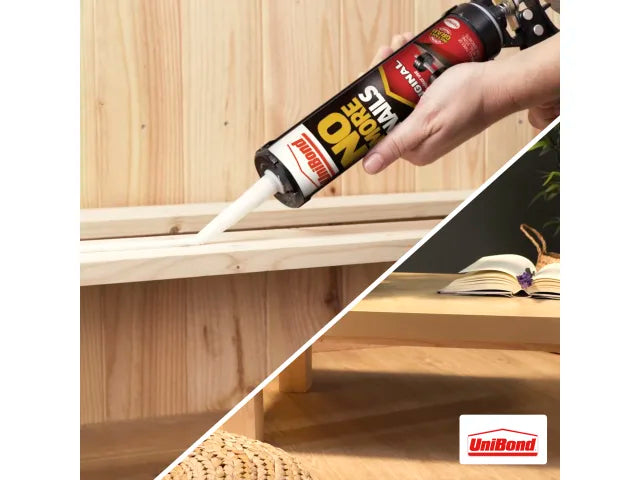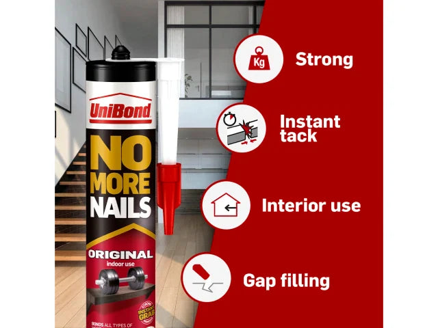 UniBond No More Nails Original Grab Adhesive is ideal for mounting and bonding, without the need for nails or screws. Constructed with solvent-free, water-based technology, ensuring extra-strength and a professional finish.