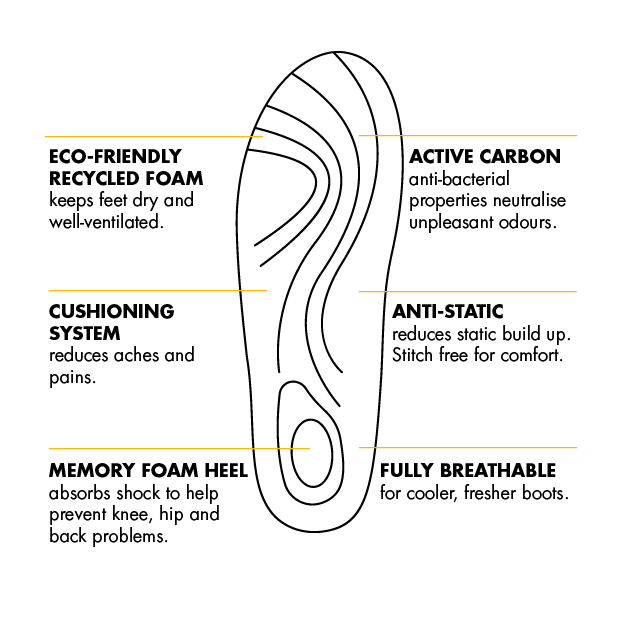 We’ve thought of every last detail for comfort and convenience in Dynamic ArchTM insoles – your feet stay cool and boots stay fresh with recycled breathable material, and these insoles even feature anti-bacterial properties which neutralise unpleasant odours.