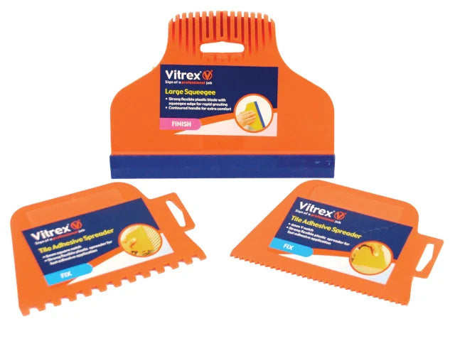 The Grout Squeegee and Spreader Set is a pack of essential tools for tile adhesive and grout application, consisting of a large squeegee, a 6mm square notch tile adhesive spreader and a 4mm V notch spreader.