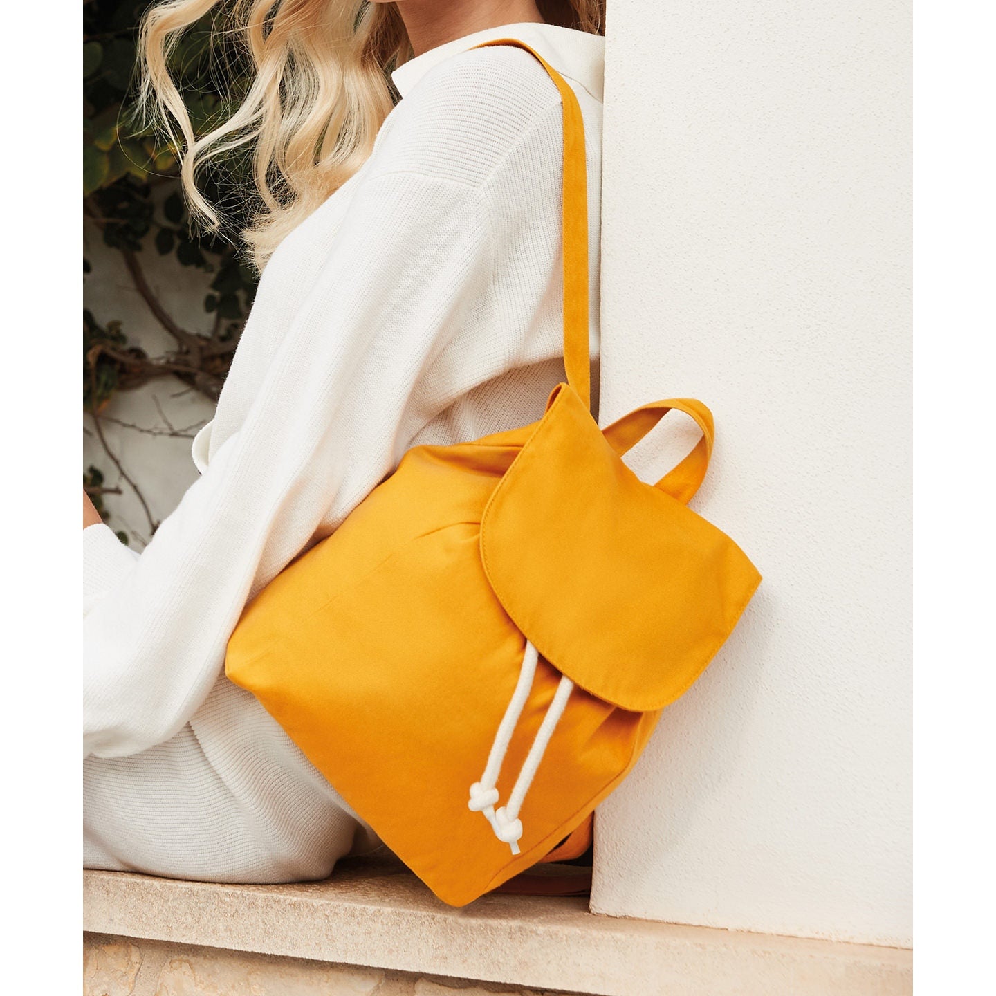 Contains 100% OCS-certified organic cotton, certified by Control Union CU811033. Premium, heavyweight fabric. Fold-over flap with secure press stud. Rope drawcord closure. Self-fabric adjustable shoulder straps. Grab handle.
