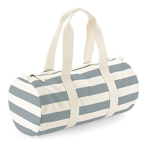 Horizontal stripes continue to influence the high street, and this Nautical Barrel Bag is a key holiday piece for fans of the maritime stripe design. Created using a soft brush cotton canvas and fashioned with comfortable webbing carry handles. This classic leisure style is perfect for both on and off the beach.