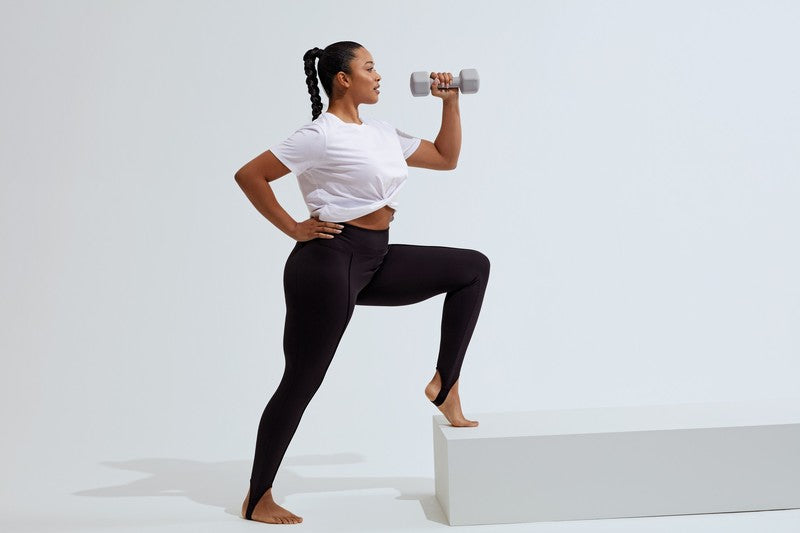 Full-length leggings. Soft-stretch fabric. Self-fabric waistband. Seam detail through centre. Elasticated stirrup design to feet. The product contains no branded neck or waist label. Removable kimble or looped garment tags. The inner seam label holds important product information on one label with a second label containing brand information which can be cut-away. We recommend using block out vinyl and inks. Oeko-Tex fabric only, WRAP and Sedex certified.