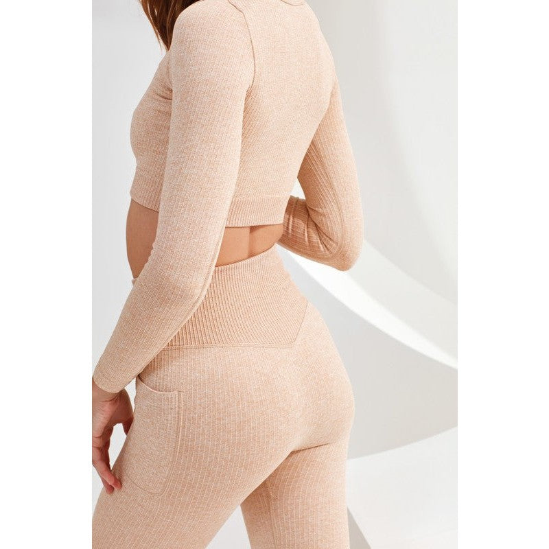 Seamless. High waistband. Ribbed cuffs. Stretchy. Ribbed detailing. Pockets to each upper thigh. BSCI certified. SEDEX certified. WRAP certified. We recommend using block out vinyl and inks.Product contains no branded neck or waist label.* Removable Kimble or looped garment tags. Inner seam label holds important product information on one label with a second label containing brand information which can be cut-away.