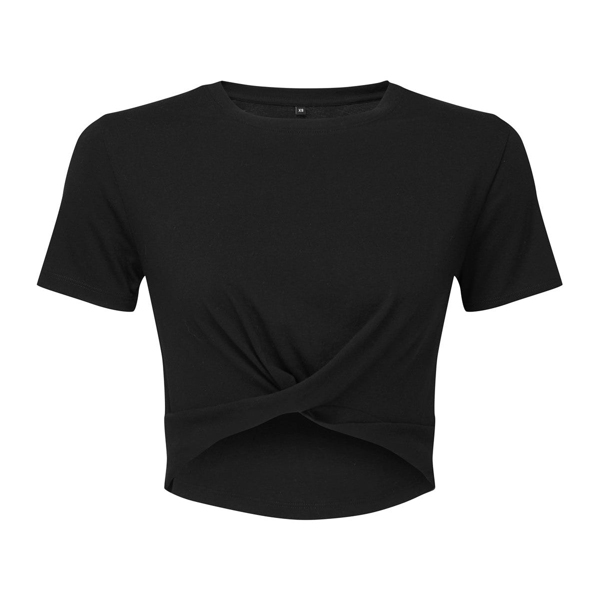 Cropped t-shirt. Short sleeve. Twist detail to front. Crew neck. The product contains no branded neck or waist label. Removable kimble or looped garment tags. The inner seam label holds important product information on one label with a second label containing brand information which can be cut-away. Oeko-Tex fabric only, Amfori BSCI and Sedex certified.