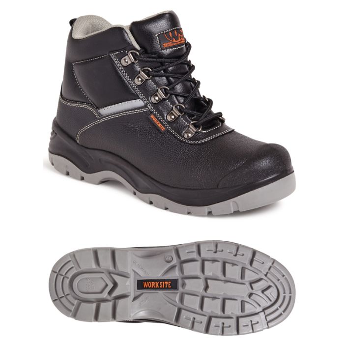 Black water resistant leather safety boot. Steel toe cap and steel midsole protection. Large padded collar and tongue for added comfort. Dual density polyurethane outsole. Anti-scuff toe guard. Anti-static. Ideal for many types of industry including engineering and construction.